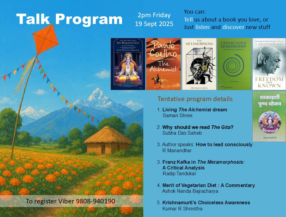 Featured Books / Topics 1. Living The Alchemist dream Saman Shree 2. How to Lead Consciously? R Manandhar 3. Franz Kafka in The Metamorphosis: A Critical Analysis Radip Tandukar 4. Why 'should We Read the Gita? Subha Das Sahib 5. Key concepts of J. Krishnamurti's Philosophy Kumar R Shrestha Moderator: Kumar R Shrestha