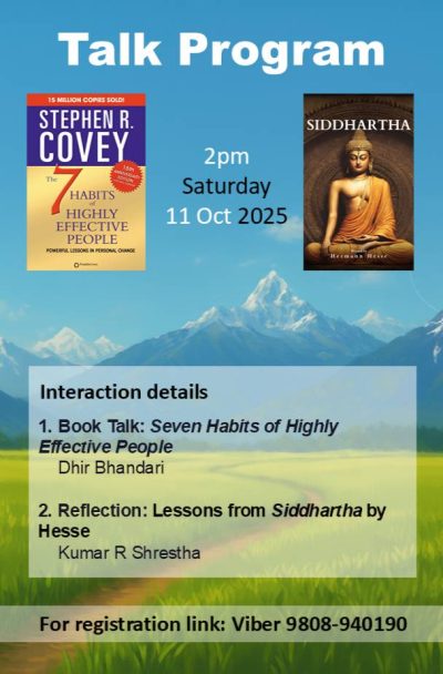 Program Details Book Talk: Seven Habits of Highly Effective People Dhir Bhandari Reflection: Lessons from Siddhartha by Hesse Kumar Shrestha