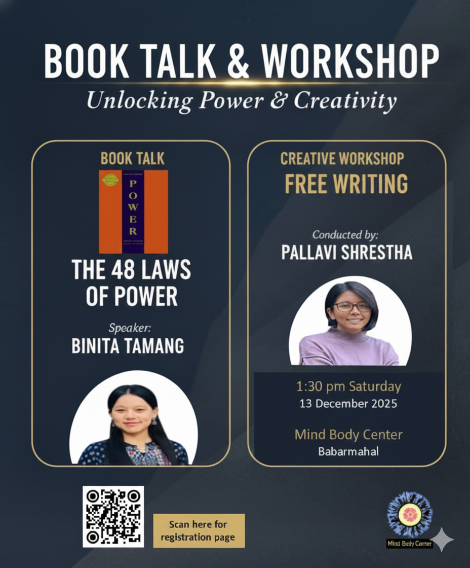 Book Talk: 48 Laws of Power Binita Tamang is a curious soul who loves the adventure of exploring life and the excitement it brings. Creative workshop: Free Writing Pallavi Shrestha loves to research and write about Nepali social setting, human choices and identities. To register for the event, click here.