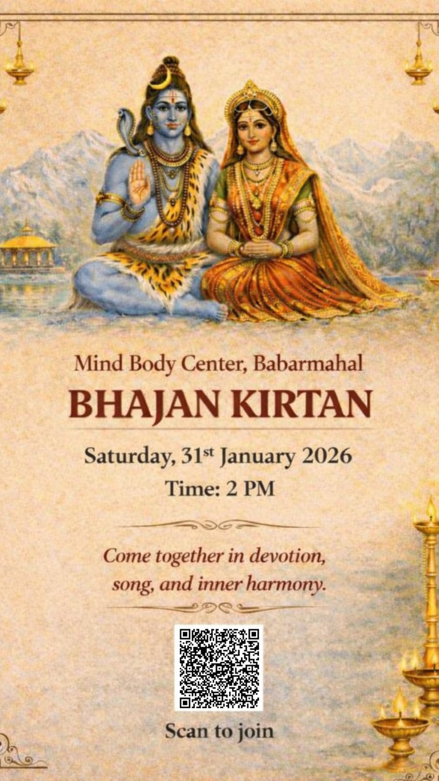 🌻 The much awaited Bhajan Session is here! 🌼 Join us for an afternoon of music, devotion and harmony. Performing artists: Mahesh & Friends Shantipath Satsangeet Seats are limited 🙏 Scan QR below to register. 💢 Register now!